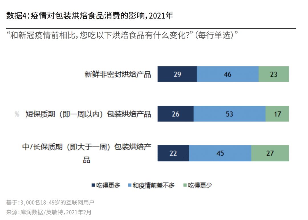 根据英敏特的调查,新冠疫情后,29%的受访者吃了更多的新鲜非密封烘焙产品,27%的人吃了更少的中长保质期产品。[12]