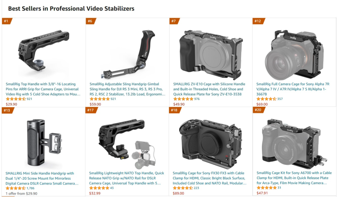 销量方面,在亚马逊公布的BS榜单中,SmallRig斯莫格多款产品均长期霸占影像细分类目榜单前列,并在“Professional.Video Stabilizers(专业视频稳定器)细分类目稳居第一。在品牌认可度方面,SmallRig斯莫格在Amazon品牌词搜索量达到200万,复购率达47%,领先全平台;旗下产品复购销售额占比32%,表现出了极高的用户黏性和品牌忠诚度。