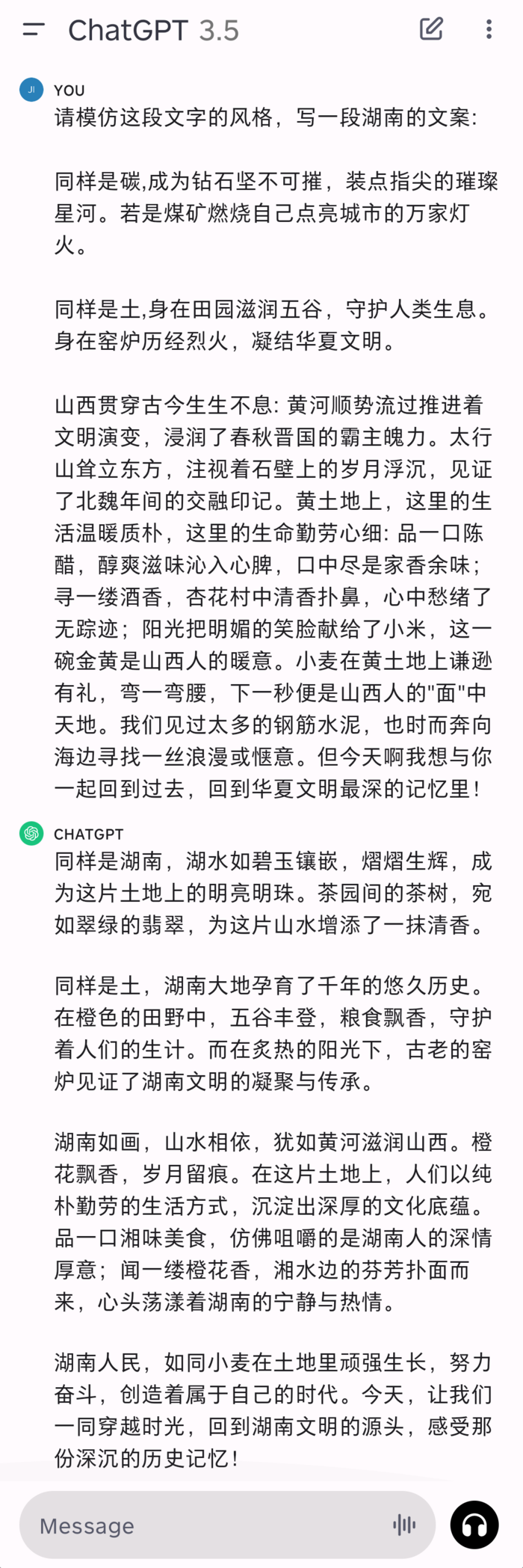 这是我替董宇辉和小编询问ChatGPT的问题。我输入了一段之前东方甄选写山西的小作文,让他拟写了一段湖南的文案。