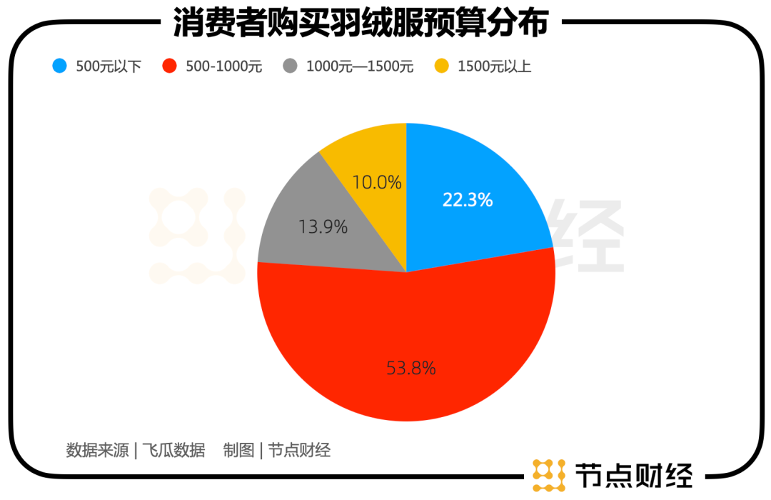 考虑到加拿大鹅、波司登等高端品牌的销售主要来自线下门店,实际千元以上售价的羽绒服销量占比会高于5%。当前尚未有关于羽绒服销售额价格段的详细统计,不过据飞瓜数据的一项“消费者购买羽绒服预算分布”调研显示,愿意购买千元以上羽绒服的消费者占比仅为25%。
