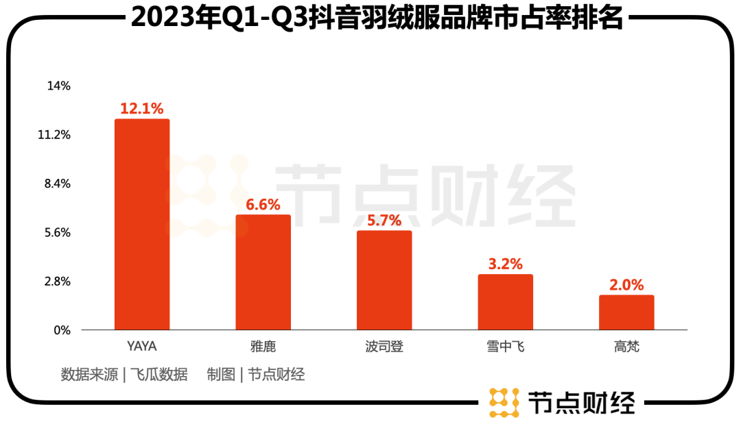 据《节点财经》了解,鸭鸭线上渠道的增长绝大多数来自抖音电商的贡献,飞瓜数据最近公布的一份报告显示,今年前三季度鸭鸭在抖音电商羽绒服市场的销售额市占率为12.1%,接近第二、三名之和。