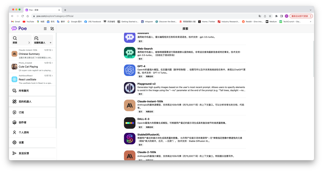 Poe是由Quora在今年2月推出的一款聊天机器人集成产品,它是最早一批和OpenAI合作的第三平台,也是最早集成LLM的平台。它集成了GPT-3.5、GPT-4、Claude、DALL-E、StableDiffusionXL等市面上主流的大模型。只需每月19.9美元或每年199.99美元,用户就可以在一个平台上无缝切换地使用多个大模型。