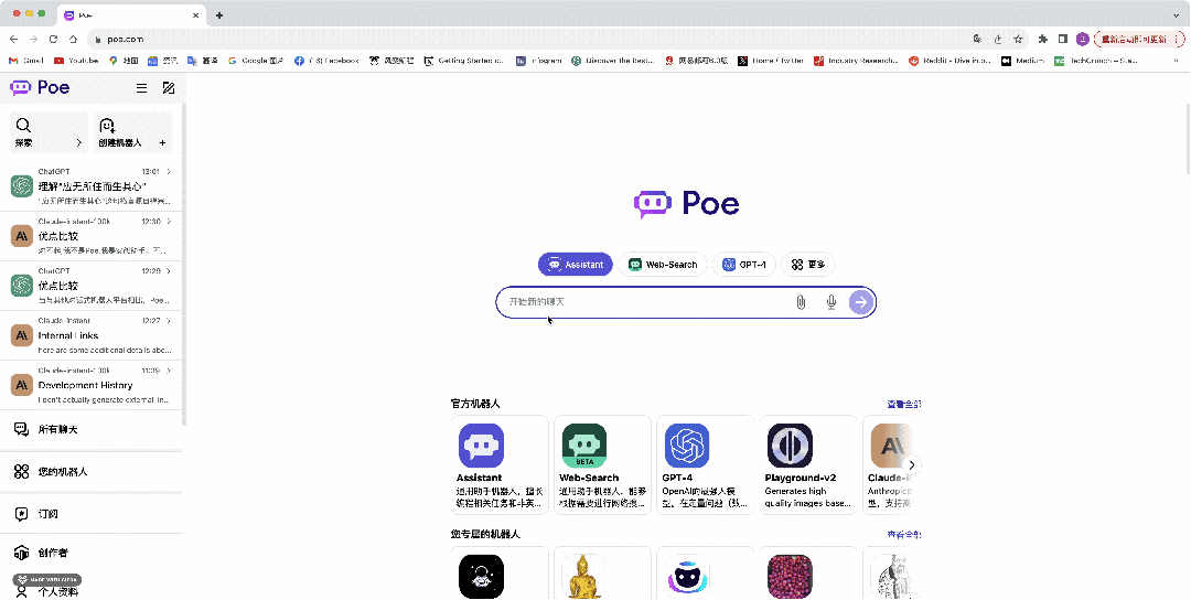 Poe是“美国版知乎”Quora出品的AI Chatbot平台,它集成了ChatGPT、Claude-insant(类似GPT-3.5)、GPT-4、Claude2,Google-PaLM、Llama2等主流的AI大模型,可以让用户以一个账号使用多个大模型,让用户在大模型之间自由跳转的同时,还能免去开多个会员的繁琐。