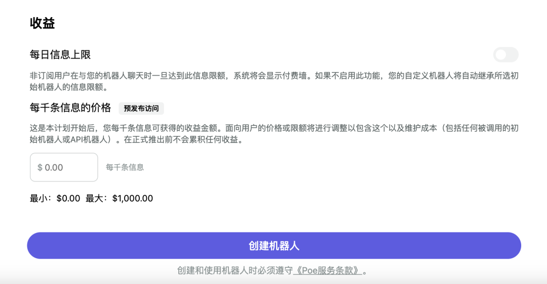 值得一提的是,2023年10月29日,Poe推出了重大更新——他们为自定义机器人上线了“货币化”的功能,用户在创建自己机器人的步骤中,可以设置每千条回复的收费额度,进而从其他用户的使用中赚取一定的收益。