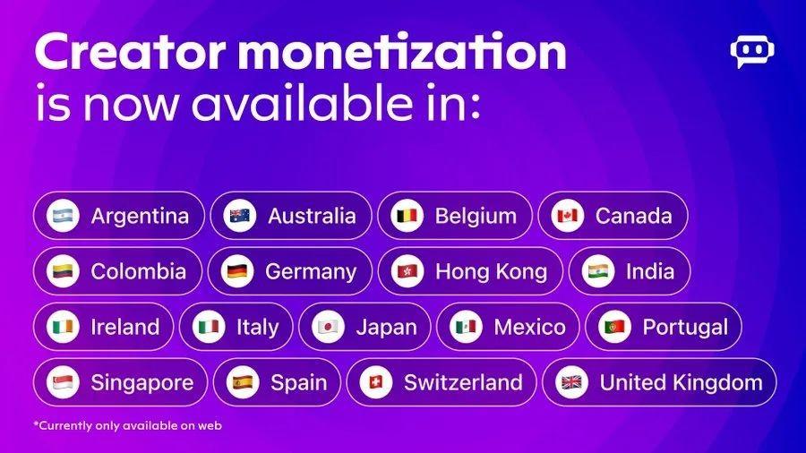 12月20日,他们还将自己的“创作者货币化”计划拓展到了17个新的国家和地区,包括阿根廷、澳大利亚、比利时、加拿大、瑞士、英国、中国香港等。