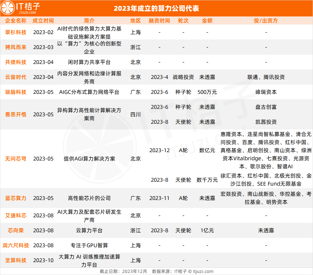 IT 桔子数据显示,2023 年中国新经济创业公司中,涌现了一批算力公司,为另一大热门创业赛道。从新成立的公司类型分布上来看,既包括计算芯片、大数据等算力基础设施类企业,也包括边缘计算、异构算力、AGI 算力等算力算法企业。