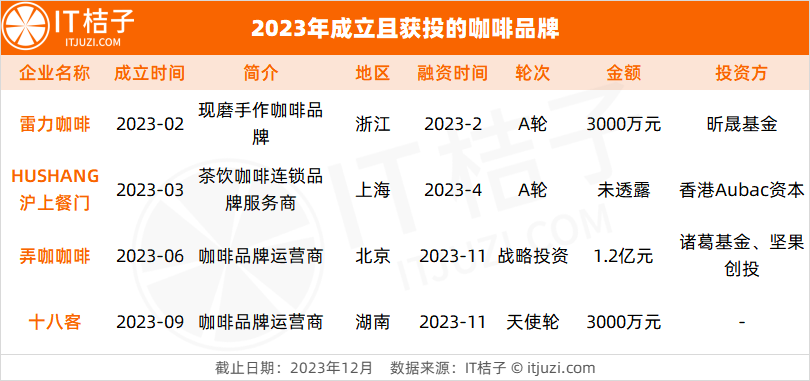 即便是在 2023 年新成立的咖啡品牌,也有 4 家企业获得资本投资。且成立于 2023 年 6 月的弄咖咖啡,首轮融资便收获来自诸葛基金、坚果创投的 1.2 亿元融资。