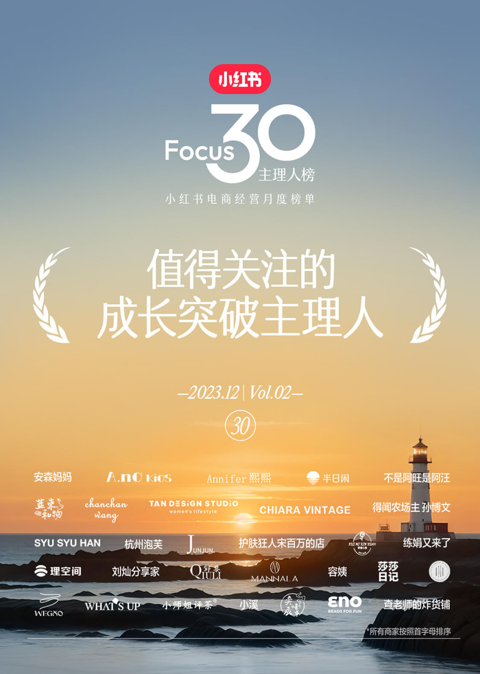 12月26日,「Focus30」小红书电商经营月榜第二期正式公布,时尚潮流、家居家具、文玩手工艺等领域的30位主理人登上榜单。