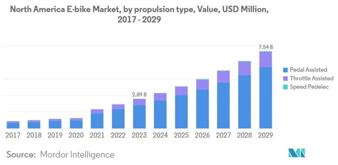 据市场研究公司Meticulous Research预测,欧洲电动两轮车市场将不断扩大,从2021年到2028年,复合年增长率预计将达到43.1%,到2028年增长至2106.3亿美元的规模。Mordor lntelligence报告显示,2023年北美电动自行车整体市场规模估计为28.9亿美元,2017-2022年的复合年增长率为26.85%;预计到2029年市场规模将达到75.4亿美元,复合年增长率为17.33%。