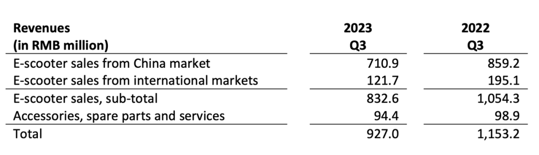 (图注:小牛电动2023年第三季度电动车营收情况,其中在中国市场销售收入为7.109亿元,海外市场为1.217亿,占整车总收入的14.6%)