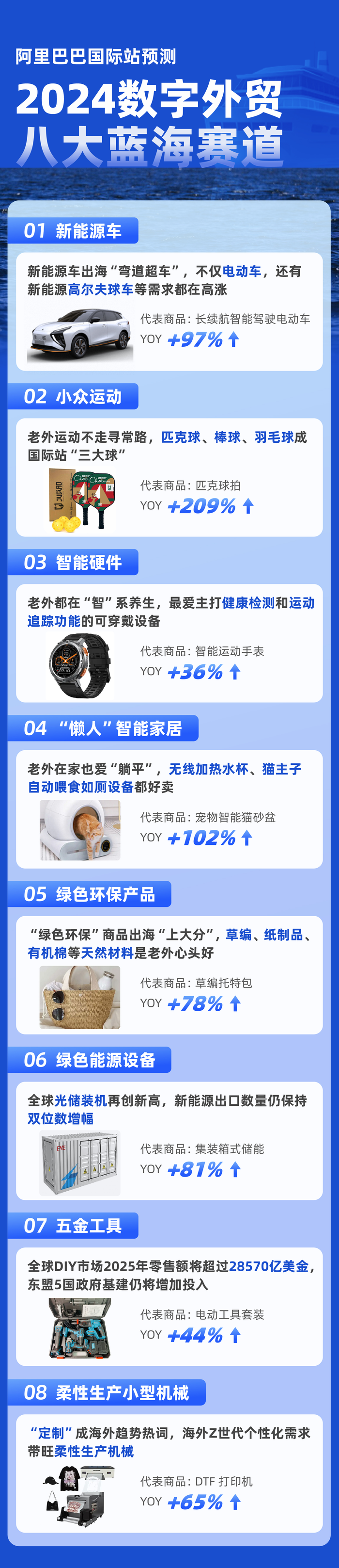 2024年数字外贸蓝海赛道中,新能源车、小众运动、智能硬件、“懒人”智能家居、绿色环保产品、绿色能源设备、五金工具、柔性生产小型机械等上榜。