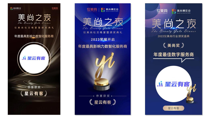 星云有客凭借国内领先的公私联动的一体化智能营销解决方案,以及在消费品牌、主播达人、MCN机构等领域内的高度好评反馈和市场高占有率,再次荣获「2023年度最具影响力数智化服务商」奖项。这是继2022年和2021年「年度最具影响力数智化服务商」奖项后,仪美尚和行业内连续3年对星云有客的高度肯定。