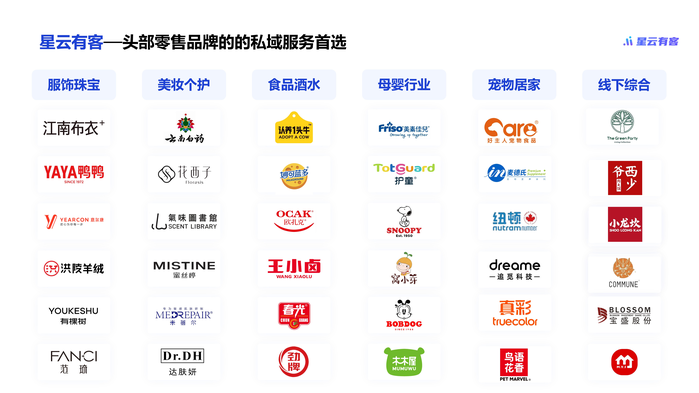 凭借业内领先的公私联动的一体化智能营销解决方案,星云有客备受消费品牌关注,成为当前多数企业的私域服务首选。成功获得认养一头牛、妙可蓝多、美素佳儿、江南布衣、云南白药、花西子、蜜丝婷等知名消费品牌的高度认可。
