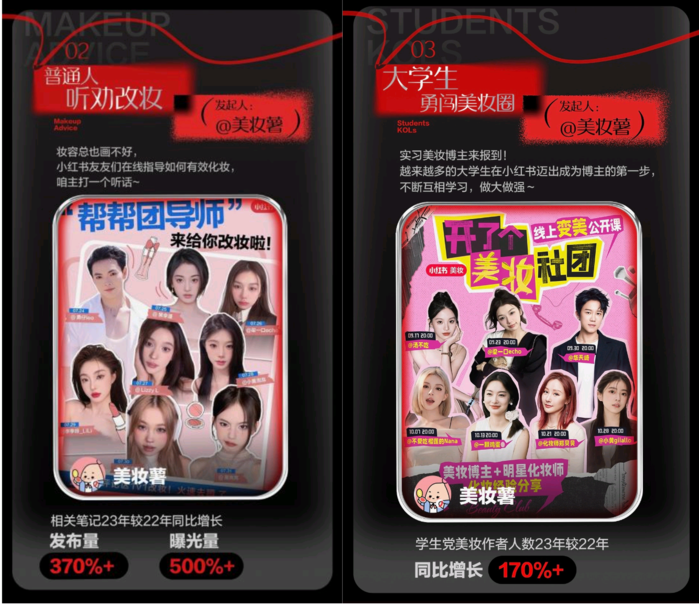 这一年,小红书还涌现了很多真诚分享的变美帮帮博主。@阿里北杯、@茶儿CHARR等人获评「年度官方活动帮帮团」,在2023年由美妆薯发起的官方互动中积极参与线上线下改妆;@爱吃榴莲、@安琪等人获评「年度实力博主帮帮团」,在美妆护肤领域年涨粉超20万;@超级爱吃辣的cc、@学化妆的姚阿姨等人获评「年度新锐博主帮帮团」,年涨粉超10万,创作美妆护肤笔记量占年总笔记量的60%及以上。