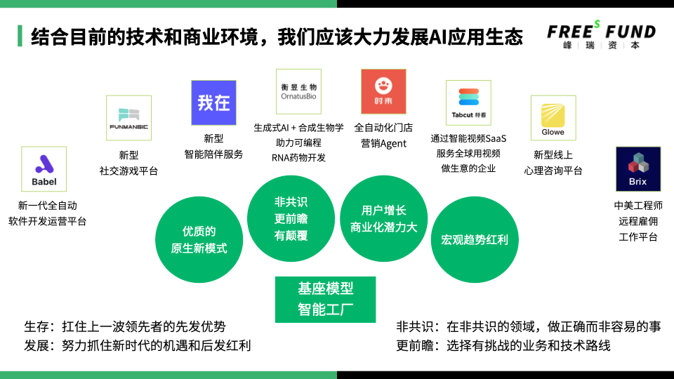 上图是我们投资的生成式AI相关的创业公司,包括:为语言模型设计的新型DevOps平台、社交游戏平台、智能陪伴服务、AI辅助RNA药物开发、门店自动化营销、服务全球的智能商业视频SaaS、新型线上心理咨询平台和中美工程师远程雇佣工作平台等等。