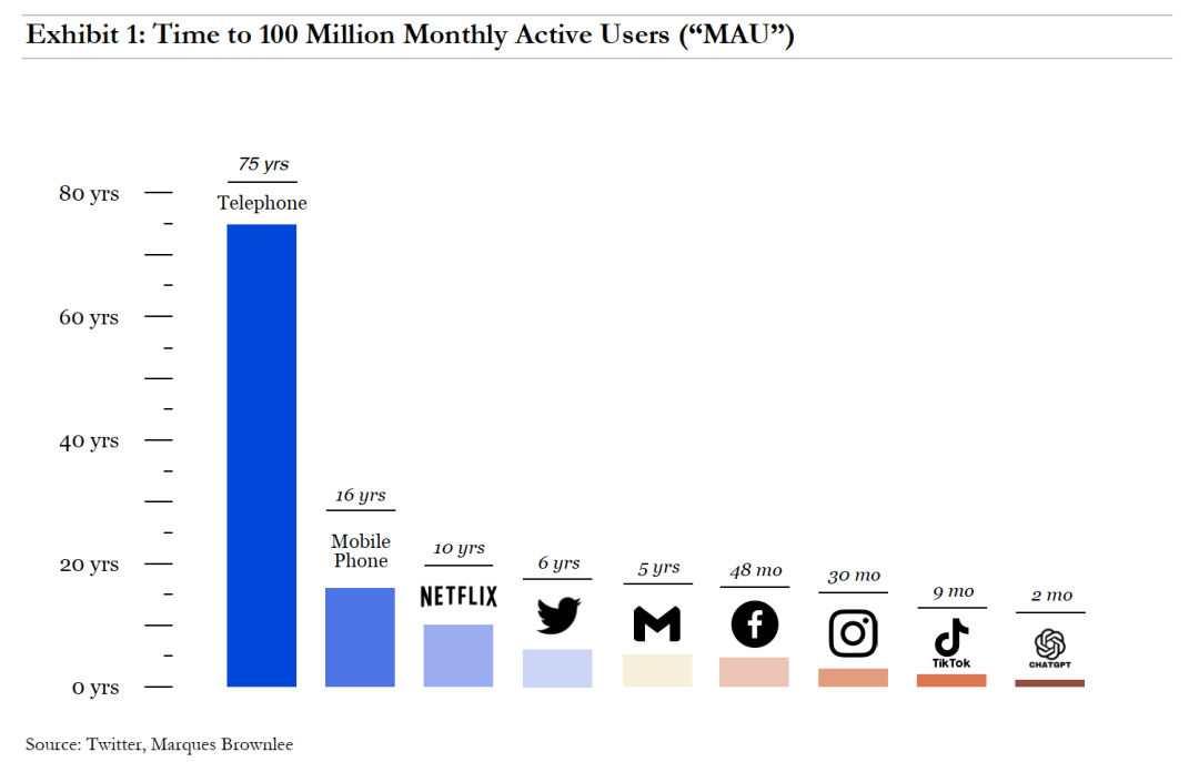全球用户对生成式AI展现出极大的热情。ChatGPT在短短2个月内,达到1亿月活跃用户数。相比智能手机时代的超级应用们,在大量推广预算之下,TikTok用了9个月,Instagram用了2.5年,WhatsApp用了3.5年,YouTube和Facebook用了4年。