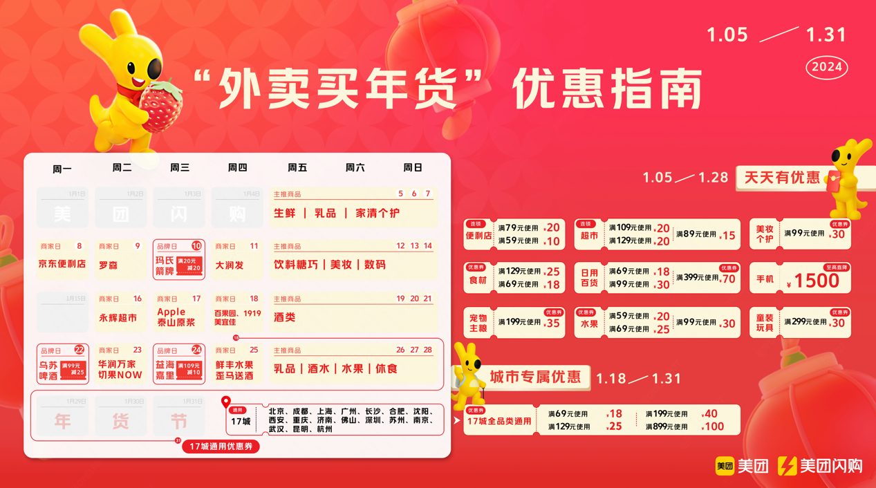 1月5日,美团闪购宣布,将基于消费者痛点,更好地发挥“外卖买万物”优势,聚焦“商品”与“服务”,正式启动2024年年货节,并持续至元宵后(2月25日)。