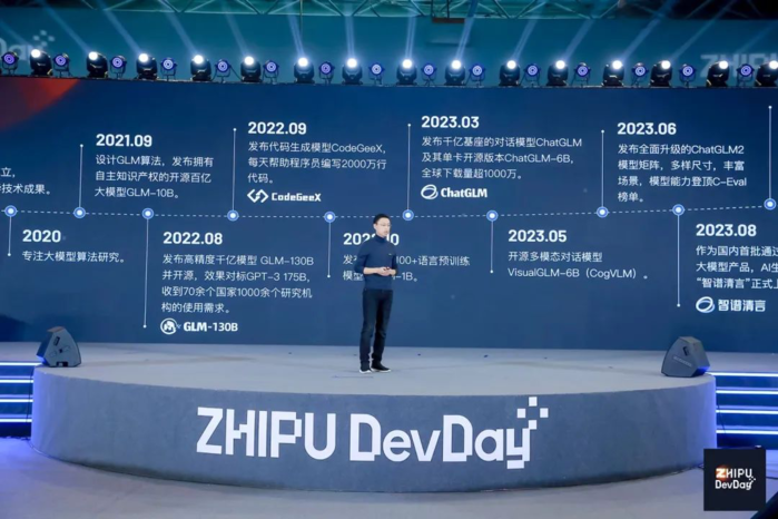“围绕GLM这样一个预训练框架我们开发了一系列模型,形成了一个相对完整的大模型全栈技术体系架构,功能覆盖了多模态、代码生成、搜索增强和对话。对标着OpenAI的全栈大模型生态,我们努力赶上。同时,我们也谦虚的承认自己还存在一定差距,但不懈努力让我们开始逐渐形成我们自己的创新特色,也借助于此逐渐缩小与顶尖水平的差距。”张鹏介绍。