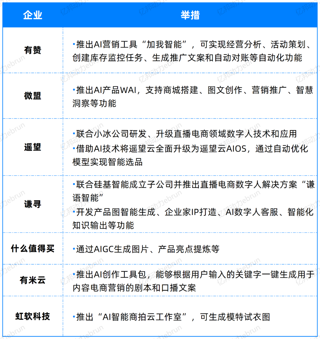 同时,除了上述大厂在AI研发和应用层面树起标杆,中小企业同样积极拥抱AI。他们中不仅有“尝鲜者”也不乏“卖水人”。而这些企业在数字人、AIGC在电商领域的应用和尝试相对最为广泛。
