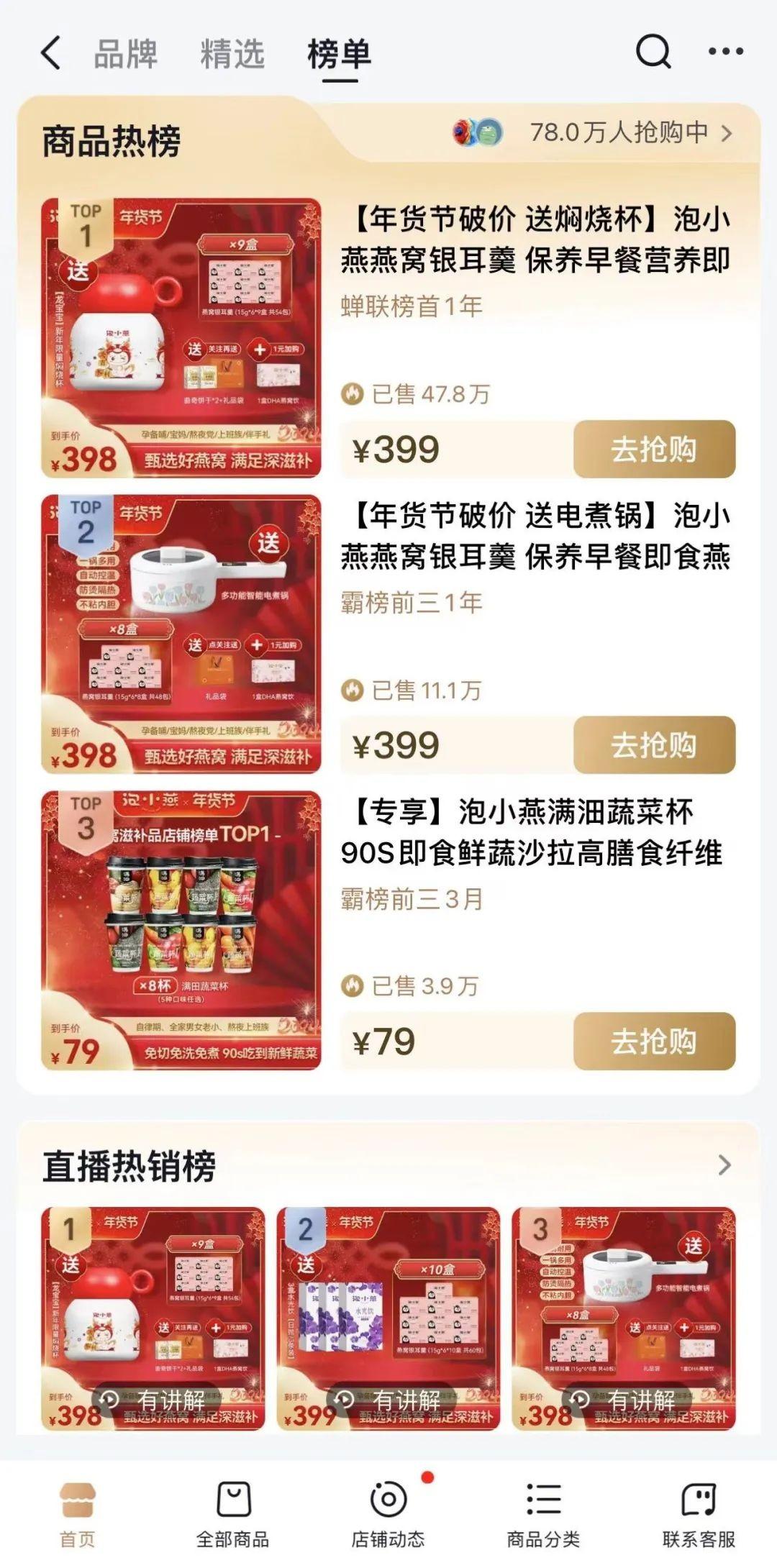 所以泡小燕主攻燕窝饮新品类。据2023蝉妈妈双十一预售期榜单,其全量销售额达5000到7500w,排名滋补品第三,超过小仙炖和燕之屋,增长231%。