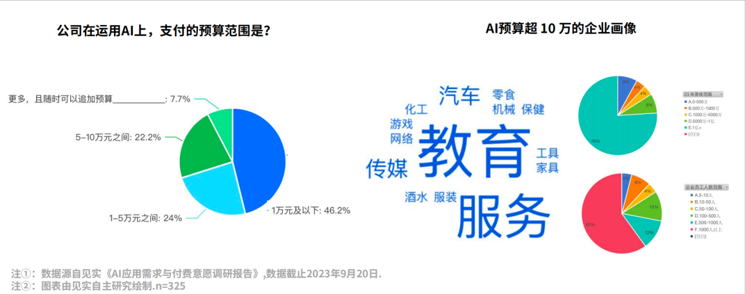 对比会发现企业在文生视频上愿意给出更高预算,这个范围的企业他们在文案生成和图片生成的预算,都已降至百元以下,而视频生成和文档分析的价格却可以超过百元。