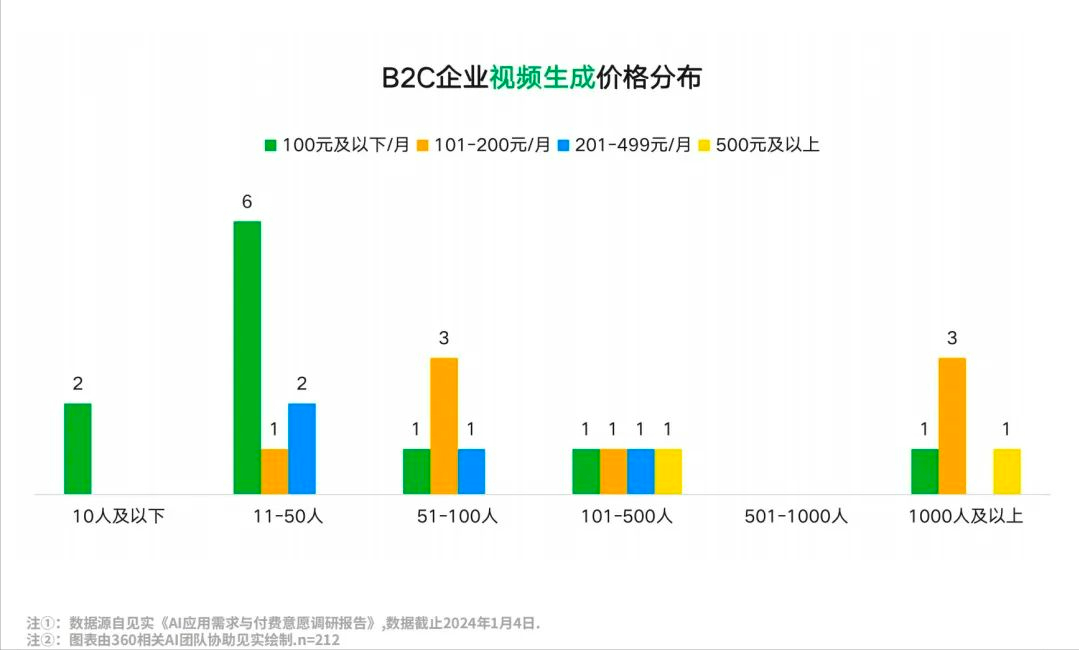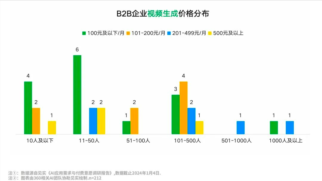 对于B2B企业而言,101-500人团队对视频生成需求更高,七成用户可以接受超过100元/月的价格。