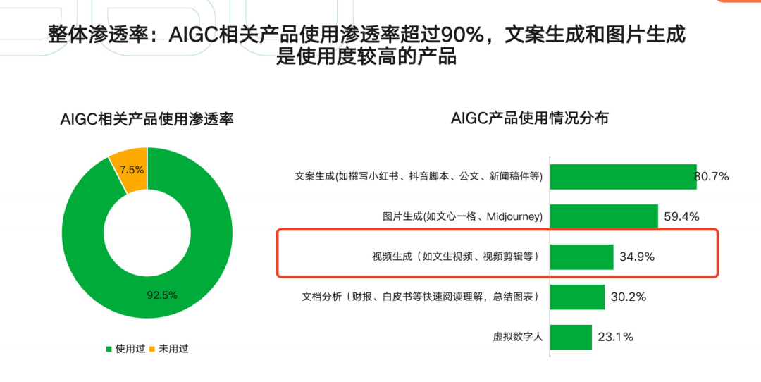 调研中,“AI文生视频”是前三大实用度较高的产品,需求为34.9%。前面两个分别为文案生成和图片生成。不过,这似乎和此前AI产品无法满足略长视频需求的现状有关。