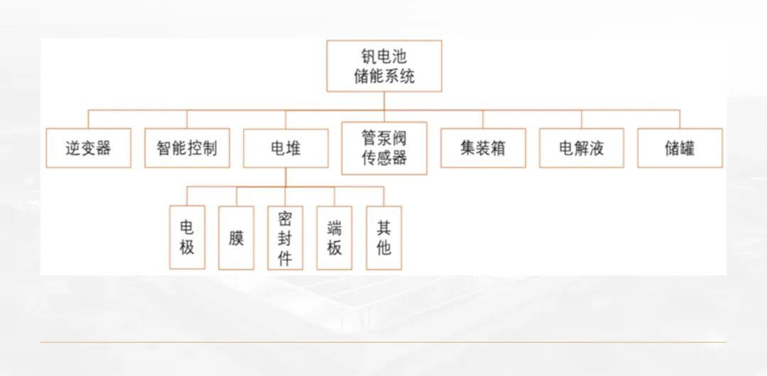 以钒液流电池为例,整个钒电池储能系统主要由电堆、电解液、逆变器、智能控制、储罐、集装箱、管泵阀传感器几部分构成。
