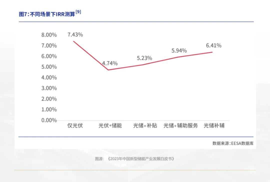 《2023中国新型储能行业发展白皮书》测算显示:以内蒙古某100MW光伏发电项目、配套20MW/40MWh储能电站为例,其内部收益率(IRR)在仅光伏发电的情景下,高达7.43%;而配上储能后,即便获得政府补贴同时参与辅助服务,IRR也仅6.41%。