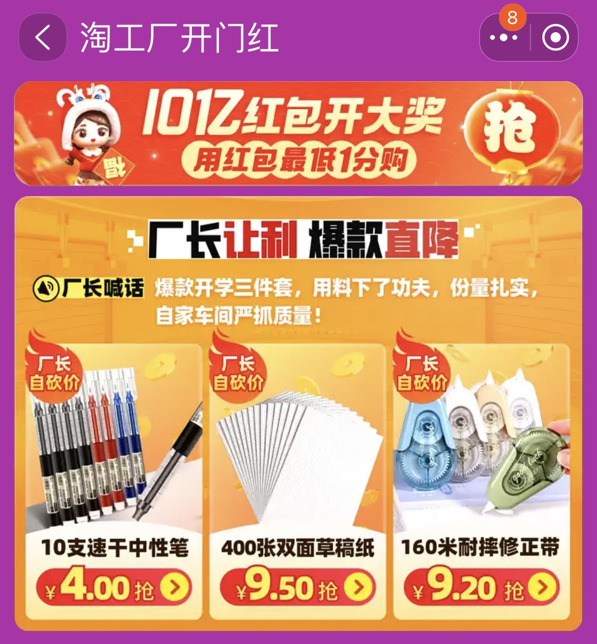 为迎接“开工季”、“开学季”,主打源头工厂直供的淘工厂联合各地产业带工厂上线了开工季、开学季,以及春日潮流礼等爆款套件。不同以往,这次主题活动主打一个让源头工厂厂长现身说法:不要买家自己讨价还价,厂长完成“出厂前自己砍价”,为消费者送上超值“开门礼”。