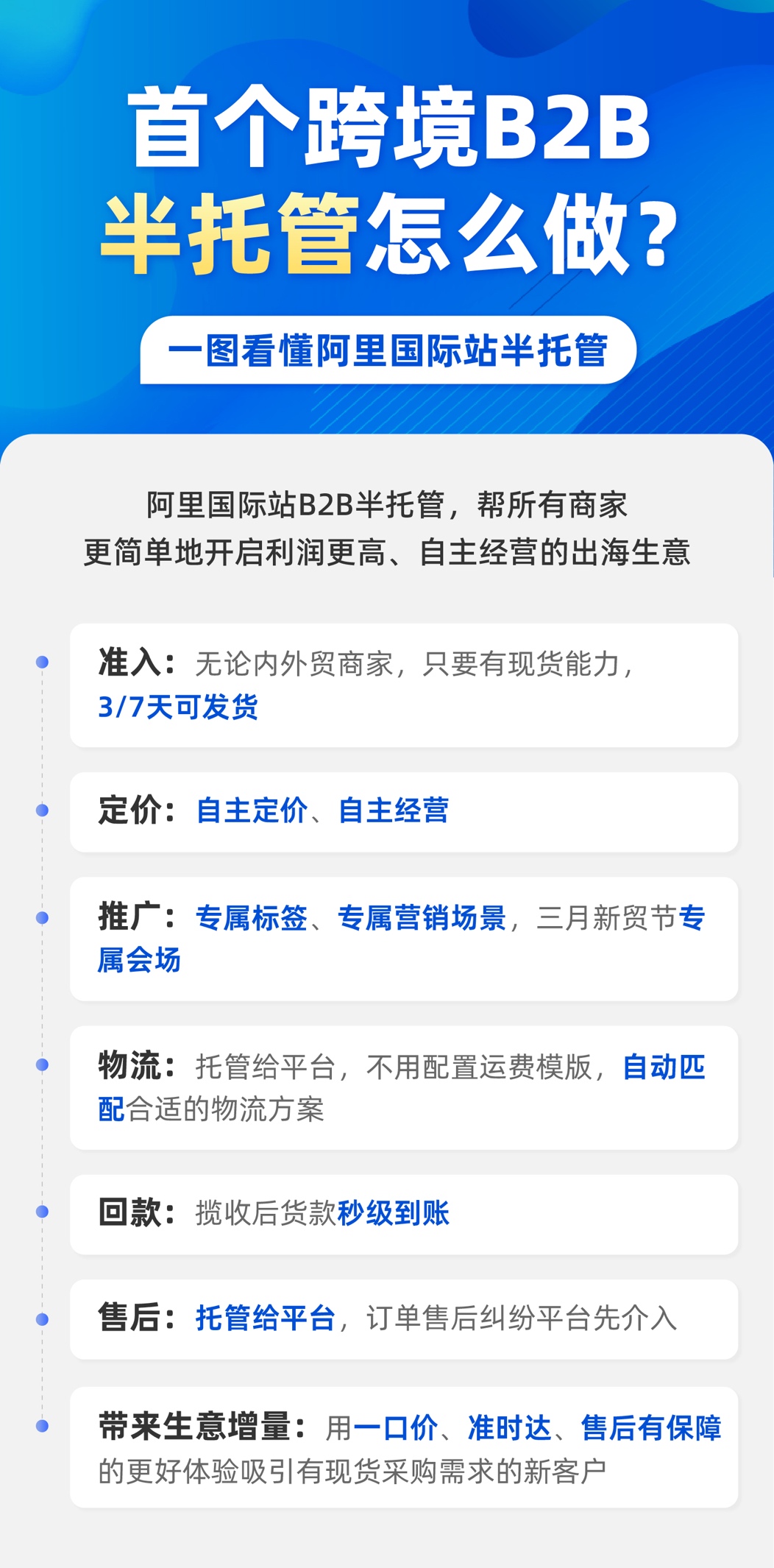 在技术进步的基础上,降低外贸生意门槛、满足海外的新需求,这成了阿里国际站推出半托管的大背景。而在今年的第一个外贸旺季“3月新贸节”期间,阿里国际站还将为半托管商品设置专属会场,或将成为外贸商家爆单、内贸商家快速出海的重要方式。