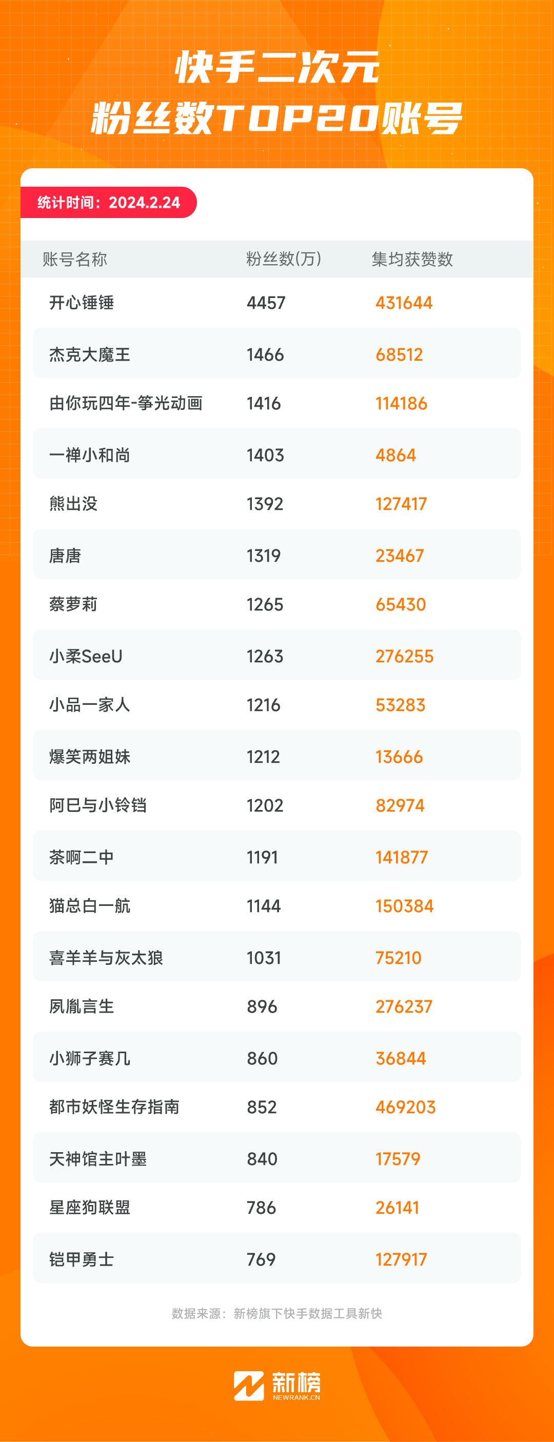 近日,新榜编辑部和快手二次元负责人刘舟聊了聊,盘点了快手二次元领域粉丝数TOP20账号,希望能找到一些答案。