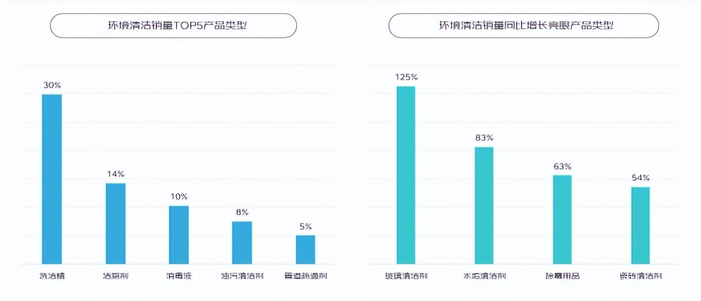 家庭环境清洁产品中洗洁精、洁厕剂、消毒液占据销量的top3,其中,玻璃清洁剂销量同比增长125%、水垢清洁剂同比增长83%、除霉用品同比增长63%。