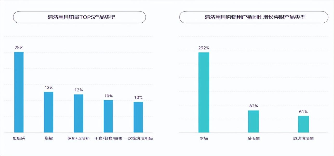 清洁用具方面,从具体的产品品类上看,垃圾袋、拖把、/百洁布这类传统意义上的清洁用具的销量分别占比25%、13%、12%,保持持续增长,此外对于具有较强实用性、能够有效提高清洁效率的用具,诸如粘毛器购物用户数同比增长82%、玻璃清洁器购物用户数同比增长61%。