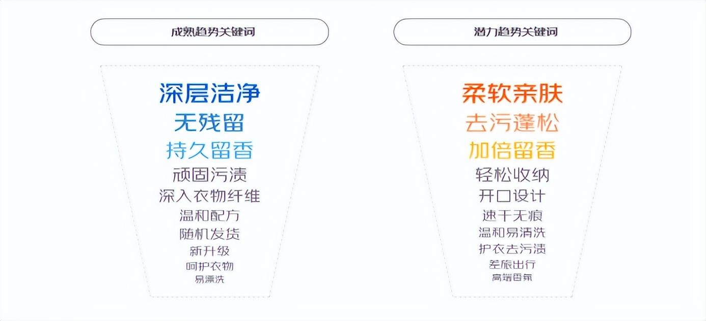 “深层洁净”“无残留”“持久留香”等是消费者在选购衣物清洁产品时最为关注的关键词。同时消费者也十分关注产品带来的舒适性,“加厚柔软”“去污蓬松”“加倍留香”“温和易清洗”等成为近一年消费者关注增长较快的关键词。