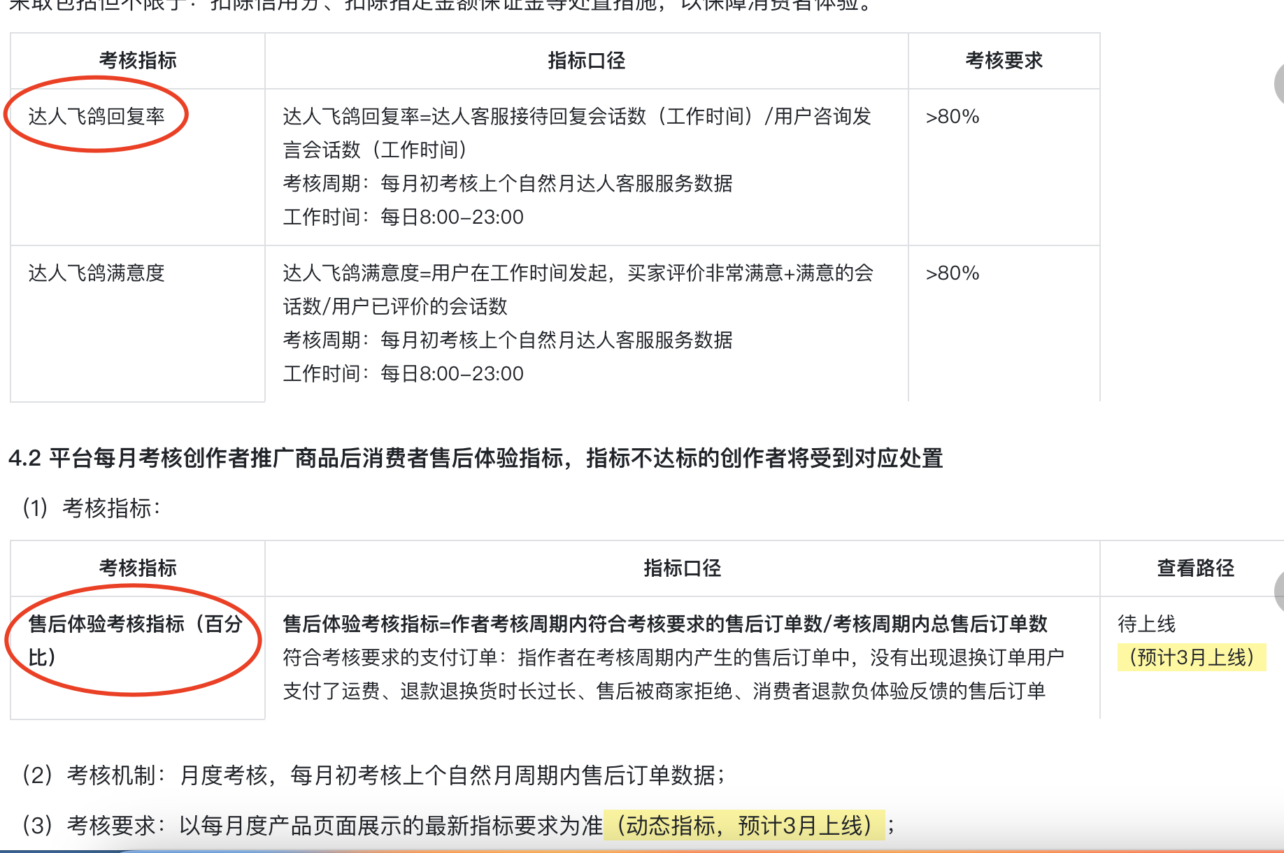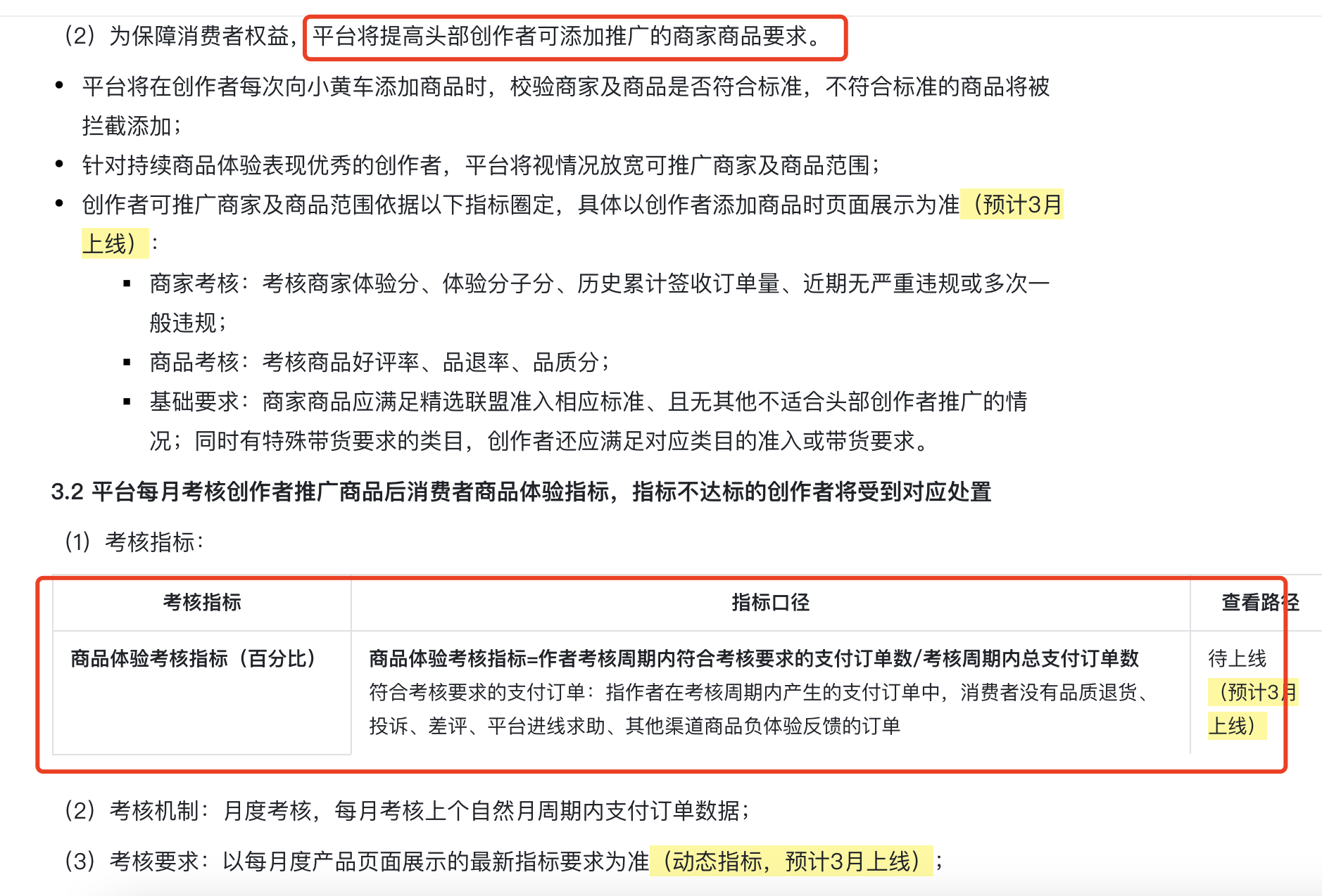 亿邦动力了解到,根据抖音电商2月更新的《抖音电商头部创作者管理规则》,平台还对头部创作者有商品和服务方面的考核要求。比如,考核商品体验、飞鸽回复率、售后体验等。