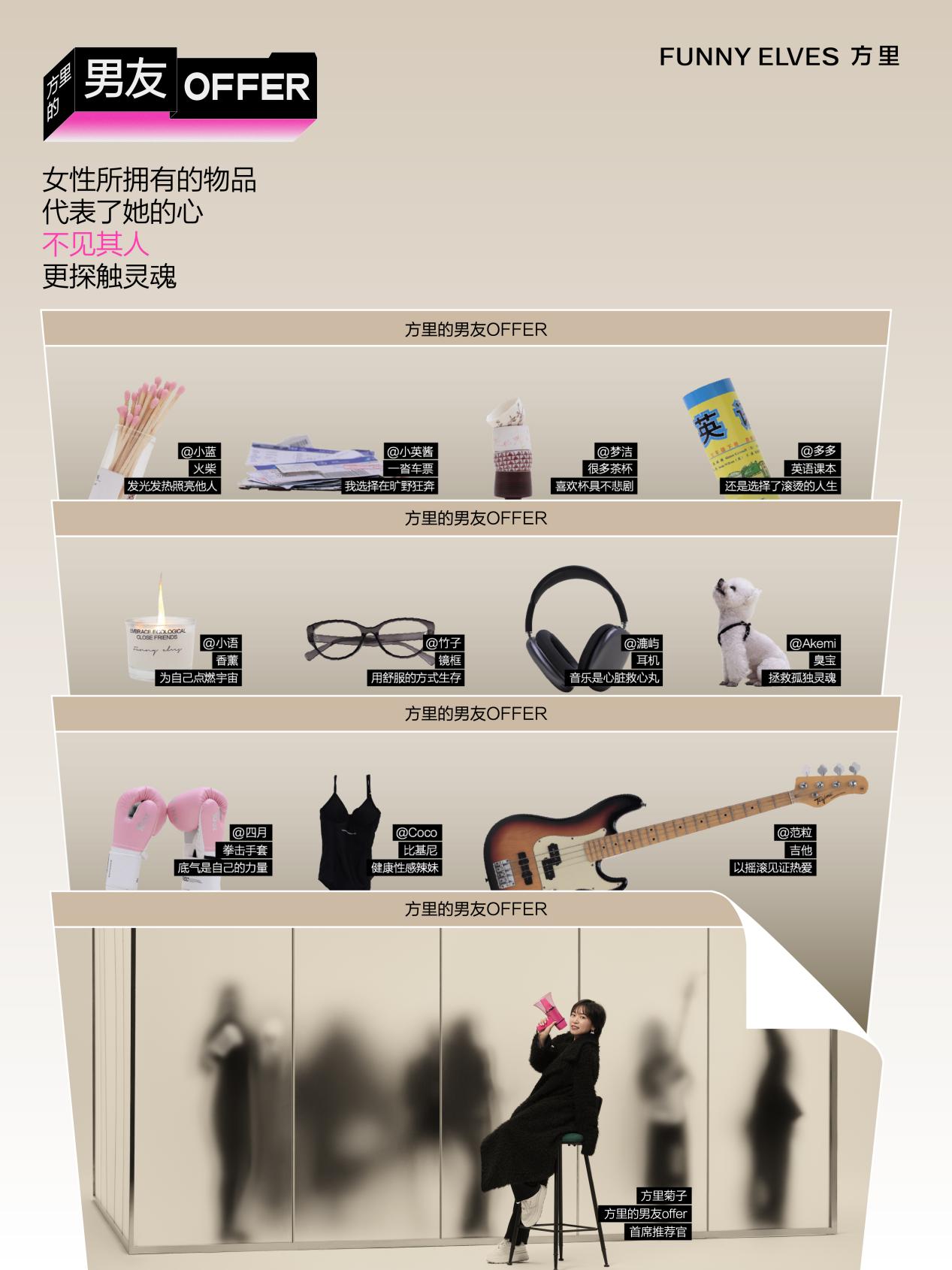多年来,恋爱、结婚一直是女性经常面临的热门社会话题。在传统的感情关系中,女性角色似乎总处于一种被动的状态:不能太主动,要矜持;不能太热情,要文静。但随着社会的不断发展,“自由”、“独立”、“清醒”日益成为女性话题的重要关键词。方里精准洞察到女性社会角色、思想见地的变化趋势。一直鼓励女性追寻美和自信的方里相信,女性角色不应再被世俗的枷锁定义,她们可以主动选择自己的喜好,探寻自己的底气,从而获得由内及外的力量。于是“方里的男友offer”,一场别开生面的品牌活动应运而生。