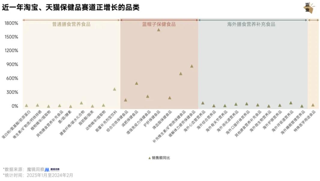 去年保健品光淘宝天猫就是接近900亿的盘子,平均增速在12%以上,一些新成分、新类目的表现甚至是翻倍增长。