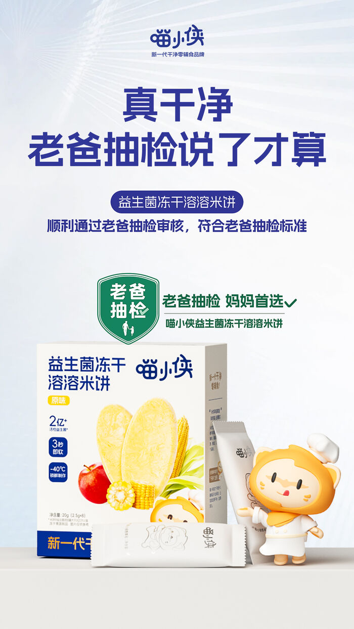 在洞察中创新,在创新中坚守“干净”品牌价值主张。喵小侠成立于2021年,用心打造新一代干净零辅食,针对年轻家庭科学育儿的需求,喵小侠从创立之初便开辟婴标系列零辅食线,覆盖面食、米饼、果泥、酸奶等多个品类。2023年更是攻破技术瓶颈将爆款产品冻干溶溶米饼升级到符合婴标标准。