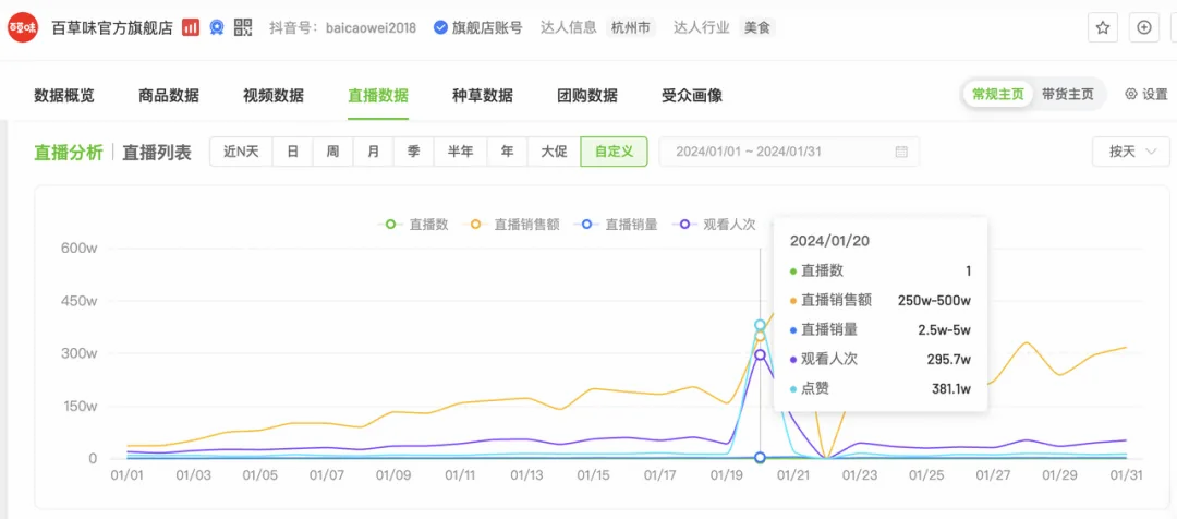 数据表现侧:百草味主要传播话题“年年有味百草味”在抖音的播放量超过2.2亿次,在微博的阅读量超过1.6亿,讨论量超过225万。同时,品牌在微博另一传播话题“白敬亭带你买年货”阅读量超过5156万,互动量超过106万。根据飞瓜数据,百草味官方旗舰店在1月20日当天有白敬亭出镜参与的直播观看人次超过295万,点赞量超过381万,为当月最高。