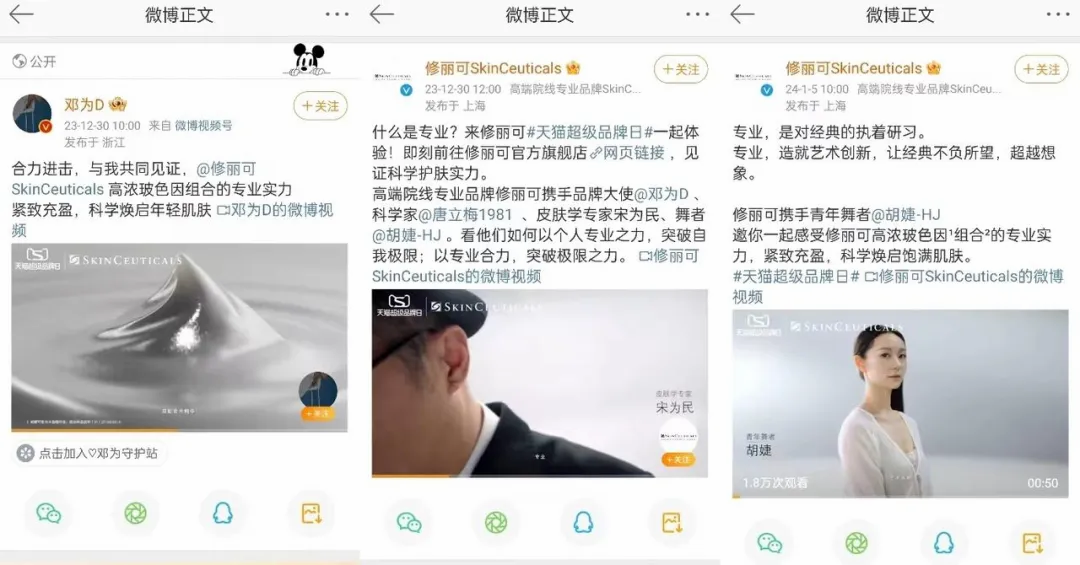 营销方面:修丽可本次超品日活动主打“专业的力量”,联合媒体《新世相》选取演艺、舞蹈、科研、皮肤护理四个不同领域的“专业人士”,以演员邓为、自由舞者胡婕与深海与极地科学家唐立梅以及皮肤学专家宋为民的个人经历及态度呈现品牌“科学、专业”等特质。