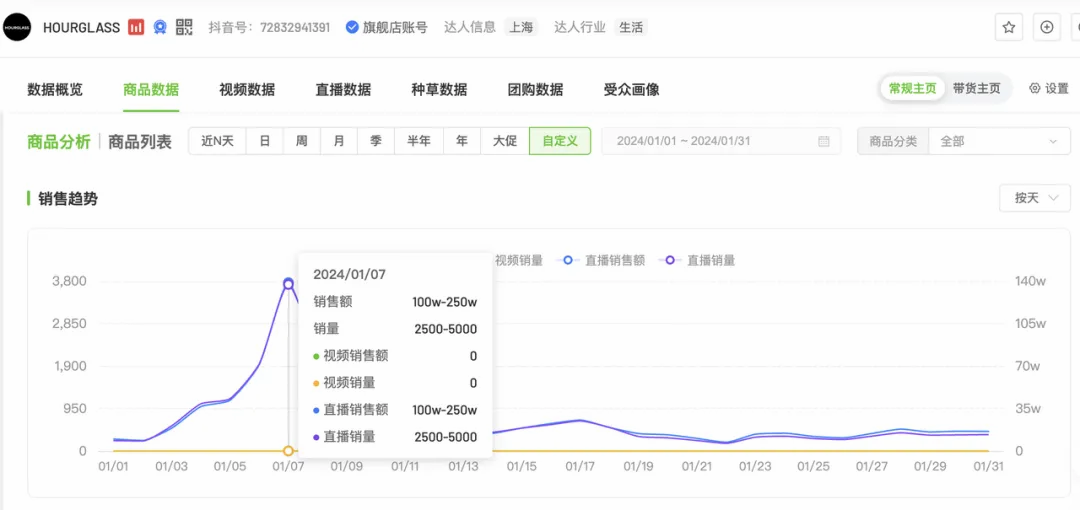 数据表现侧: HOURGLASS在抖音的主要传播话题“小金管固体唇蜜”播放量超过1亿次,与新晋代言人钟楚曦共创的全新代言大片点赞量超过2.7万,数据表现为整月所有作品中最佳。其中,品牌1月7日直播销售额大概在100万-250万,为当月最高。