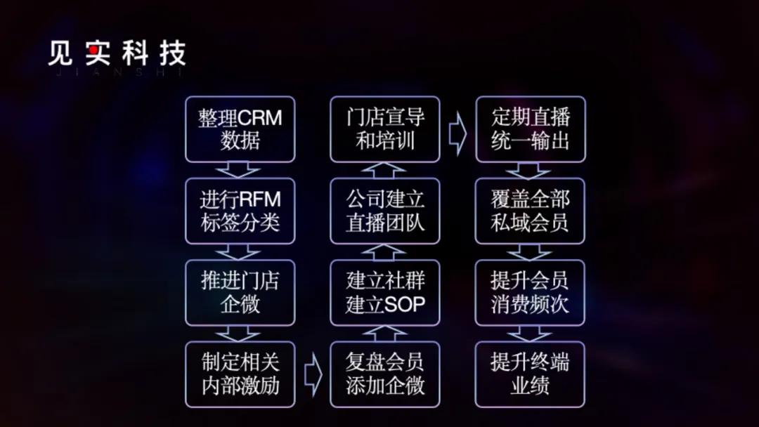 首先,整理来自全域CRM数据;其次,进行RFML标签分类,根据分类把不同客群和资料发给门店、终端,让他针对性进行邀约到门店企微里来,这里需要对内制定相应的激励和处罚政策;再然后,就是定期复盘会员和添加企业微信,建立社群和建立SOP流程,由公司来牵头组建直播团队,并提前做好门店宣导和培训。