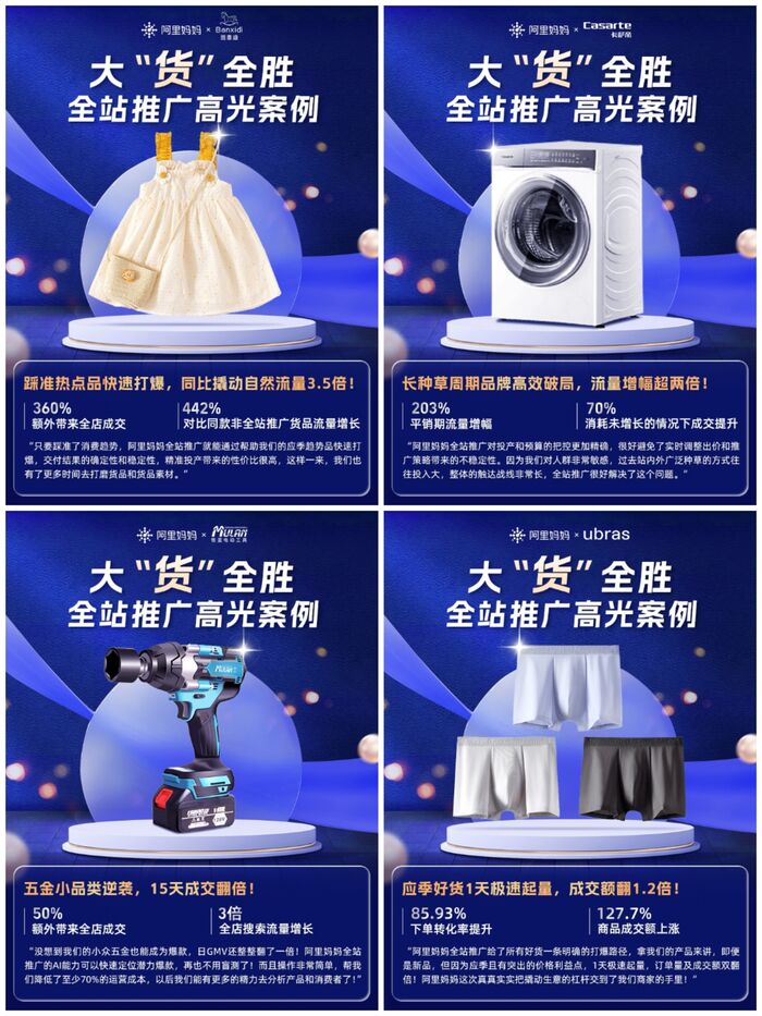 在全站推广的强大助力下,卡萨帝借助AI智能选品的精准推荐,迅速识别出站内已有一定“种草”基础的商品。通过优化宣传素材,品牌成功地突出了产品的核心卖点。同时,卡萨帝在淘系的多个端口进行有效的人群触达,这不仅显著缩短了转化路径,还实现了产品的高效推广,从而大幅提升了GMV规模。