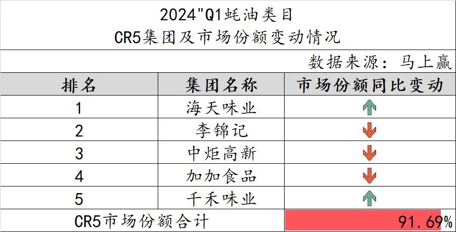 在蚝油类目中,首先值得关注的就是其CR5市场份额总和高达91.69%,可以说海天味业、李锦记、中炬高新、加加食品与千禾味业基本上瓜分了蚝油市场,留给其余品牌的空间小之又小。而在CR5内部,同比2023年Q1,除海天味业、千禾味业外,其余集团市场份额均同比有所下降。可以推测蚝油赛道的竞争集中于头部品牌内,其余品牌暂时难以对其构成威胁。