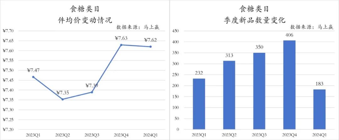 食糖类产品的件均价基本上在7.35元至7.65元的区间内波动,2023年Q4、2024年Q1的件均价在五个季度中分别为最高、次高值。从季度新品数量变化方面来看,食糖类目的新品数量从2023年Q1开始便维持上升趋势,从232款新品逐渐增加至406款新品,但这一趋势在2024年Q1被打断,断崖式下跌至183款新品。