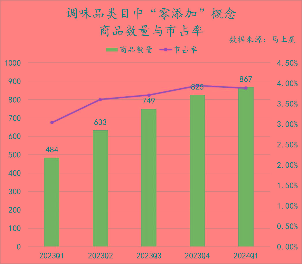 相较于“有机”,“零添加”概念在调味品类目中则更加常见,与其相关的商品数量也从2023年Q1的484款不断提升至2024年Q1的876款,增幅显著。同时,调味品市场中“零添加”概念商品的市占率也呈现出上涨的态势,逐渐接近4%。对于当前的调味品市场而言,“零添加”概念的火爆在消费观念变革与升级的背景之下已经不足为奇。在行业龙头共同发力的消费者教育之下,兼具性价比和健康属性的零添加产品在市场的渗透率不断提升,或已成为调味品企业突出重围、抢占市场空间的重要机会。