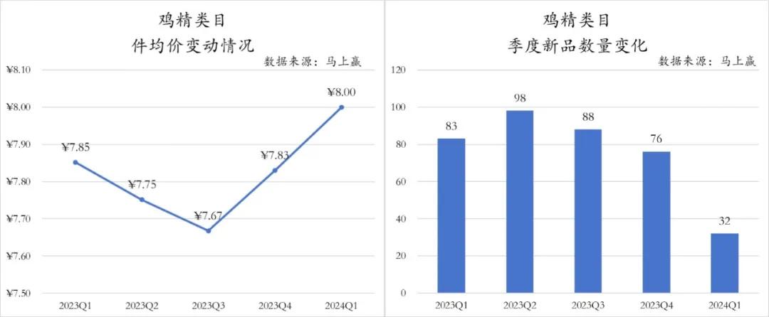 在鸡精市场中,件均价虽与前文几个类目相似,在2024年Q1达到最高值8元,但最低值却是在2023年Q3出现,整体来看呈现出“V”字走势。而在新品数量上,鸡精类目季度新品在百级范围内波动,推出新品数量最多的2023年Q2也仅有98款新品,而2024年Q1更是仅推出了32款新品,甚至不足新品数量同样较少的2023年Q4的一半。