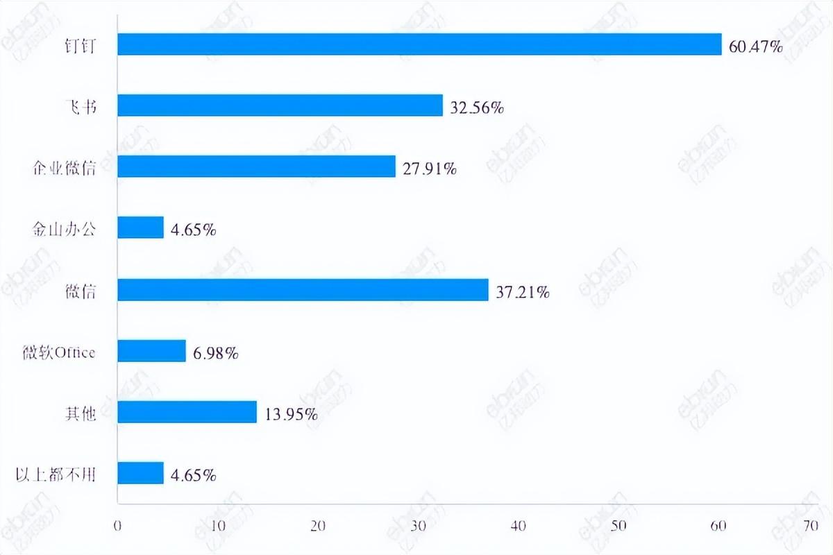 1 使用钉钉、飞书、企业微信的比例分别为60.47%、32.56%、27.91%,与目 前协同办公软件市场格局基本吻合;