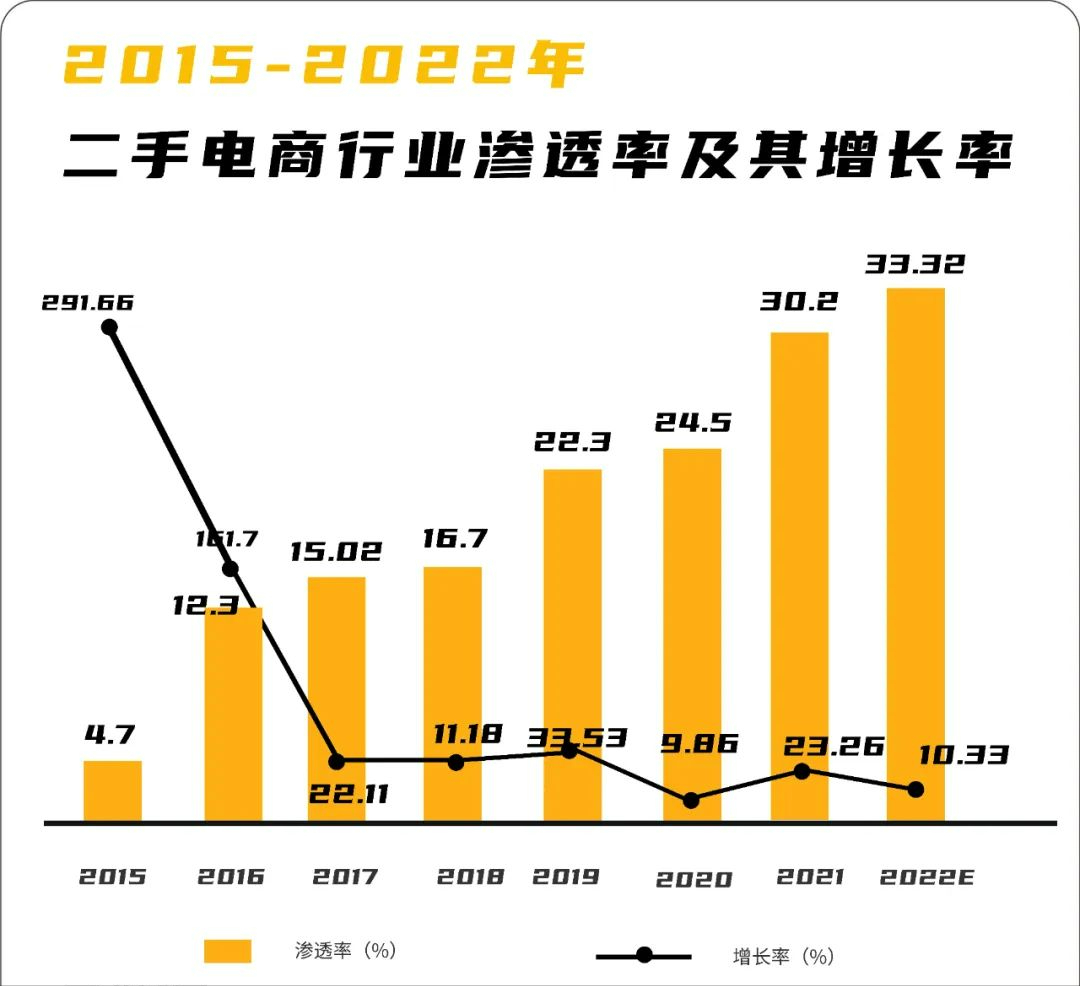 此外,近两年二手电商的用户规模及渗透率的增长率都在不同程度的下降,数据显示,2016年国内二手电商的用户规模增速高达345%,此后开始逐渐下降,截至2022年增速仅维持在17%左右。而2016年的渗透率同比增长161%,截至2022年渗透率仅同比增长10%,用户规模增速以及渗透率增长都出现明显下滑趋势。